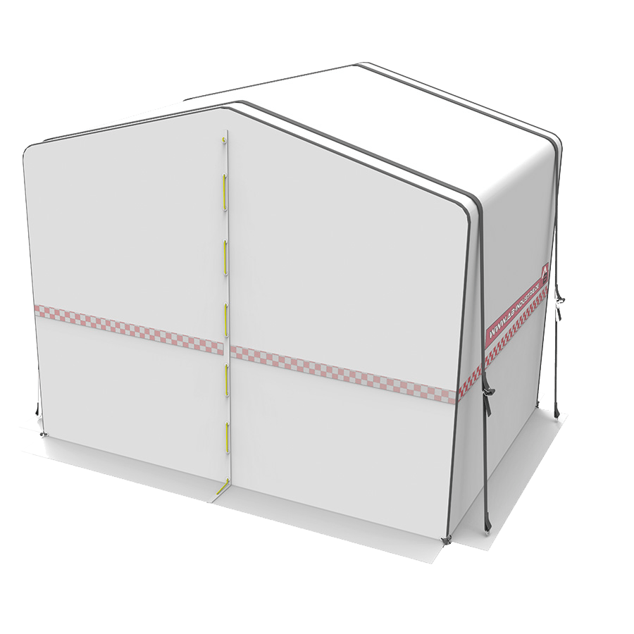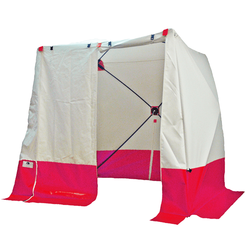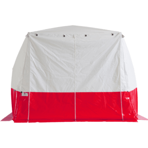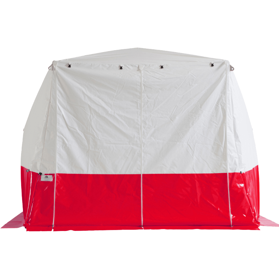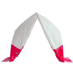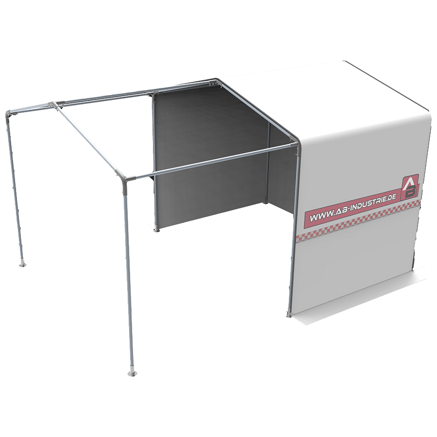 - Gerüst aus fest verbundenem Fiberglas, PVC-Gewebe (beidseitig beschichtet, ca. 600 g/m2) mit geteiltem Giebel, Eckverstärkung und roter Spritzschutzschürze.