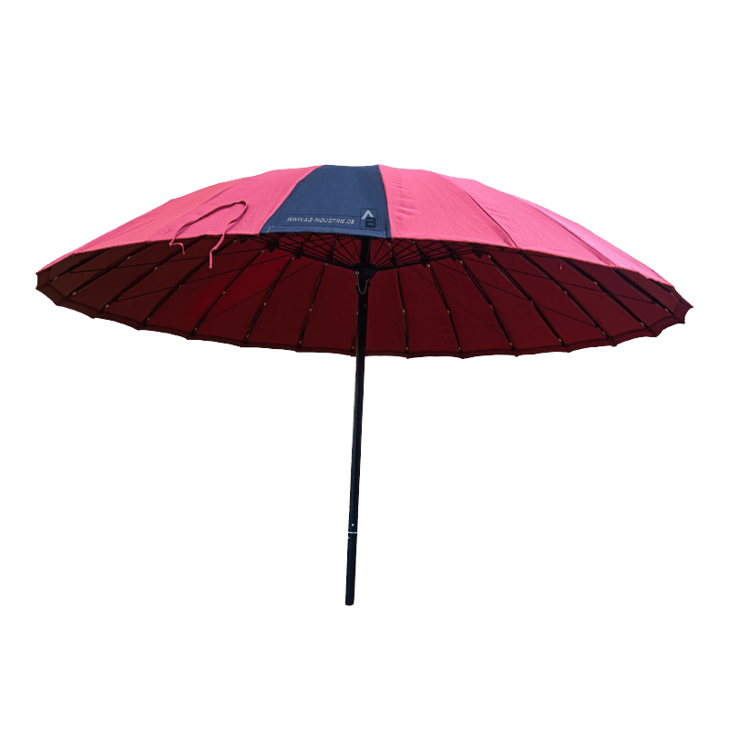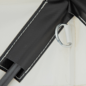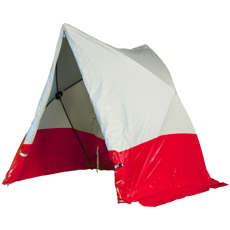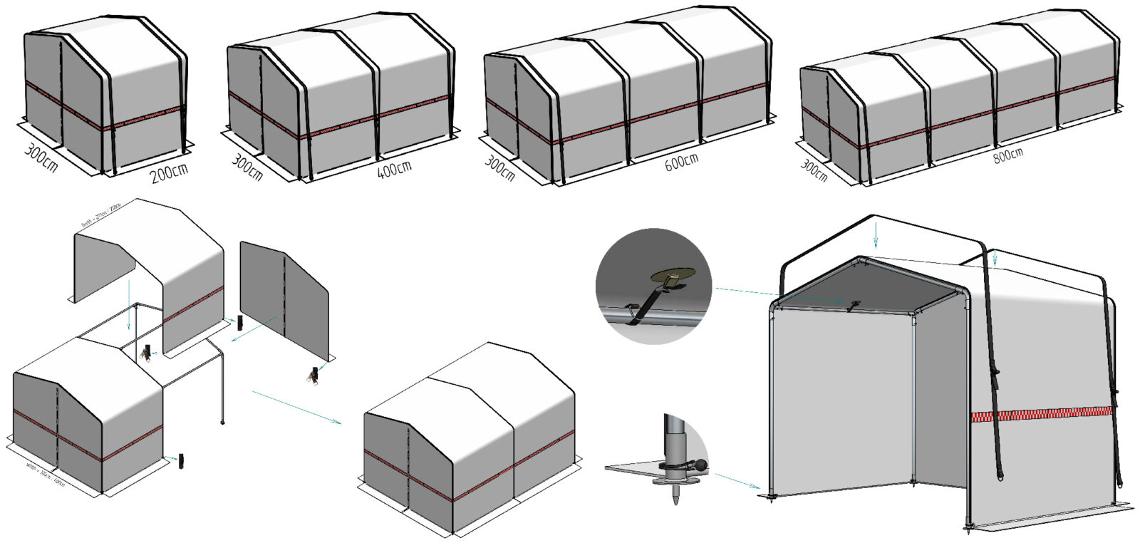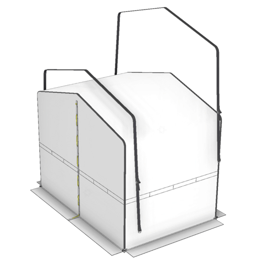 - Gerüst aus fest verbundenem Fiberglas, PVC-Gewebe (beidseitig beschichtet, ca. 600 g/m2) mit geteiltem Giebel, Eckverstärkung und roter Spritzschutzschürze.